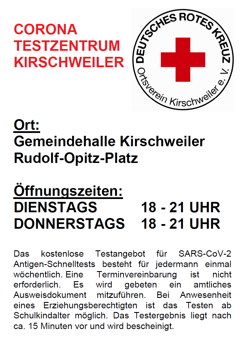 den Lokalzeitungen konnte bereits entnommen werden, dass der DRK-Ortsverein Kirschweiler seit der zweiten Märzwoche ein Corona Testzentrum für kostenlose SARS-CoV-2 Antigen-Schnelltests in Kirschweiler betreibt.