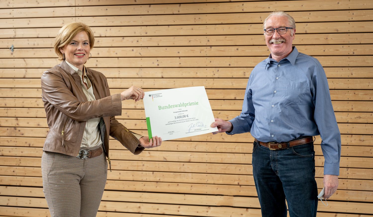 Am 27.05.2021 konnte die Ortsgemeinde Veitsrodt, vertreten durch den 1. Beigeordneten Rolf Schuch, von der Bundesministerin für Ernährung und Landwirtschaft, Julia Klöckner auf der Grundlage der "Richtlinie zum Erhalt und zur nachhaltigen Bewirtschaftung der Wälder" einen Förderbescheid in Höhe von 3.600,00 € entgegennehmen.